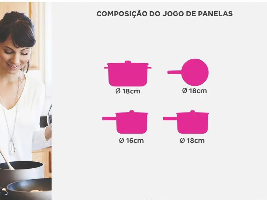 Diâmetro: - Panela: 16cm- Panela: 18cm- Caçarola: 18cm- Frigideira: 18cm